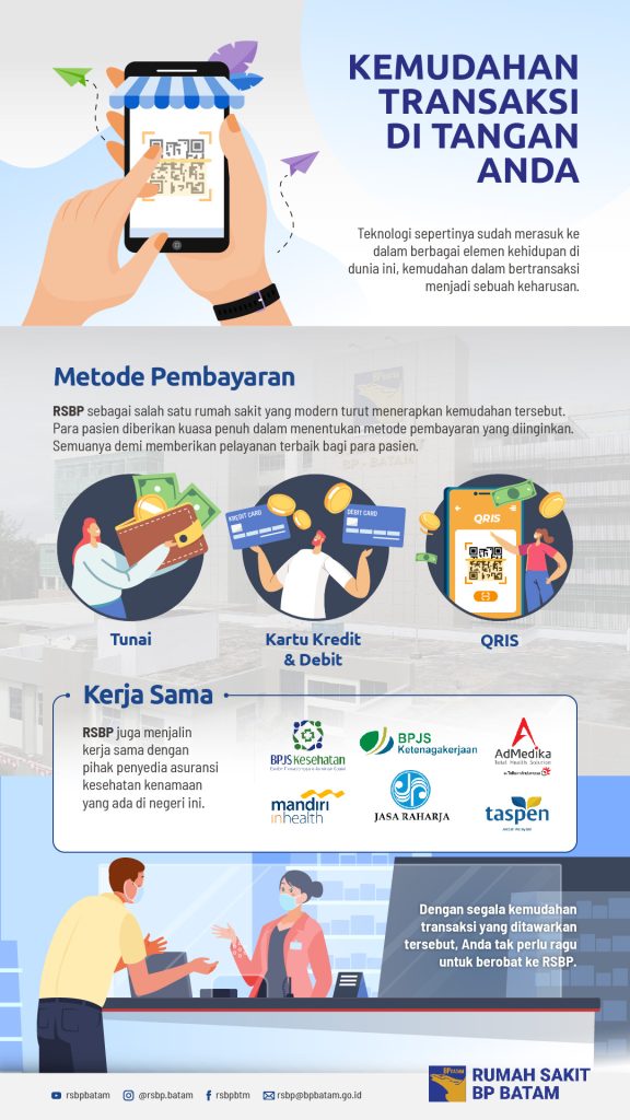 Selain metode pembayaran tunai dan nontunai, RSBP juga menjalin kerja sama dengan pihak penyedia asuransi kesehatan kenamaan yang ada di negeri ini. Anda tentu sudah familier dengan nama-nama seperti BPJS Kesehatan, BPJS Ketenagakerjaan, Jasa Raharja, Taspen, Ad Medika, dan Mandiri in Health. Kerja sama ini dilakukan untuk mewujudkan layanan kesehatan bagi semua masyarakat yang ada di Batam. Jika Anda memiliki polis asuransi kesehatan, maka tidak perlu khawatir dengan tagihan yang muncul saat berobat.